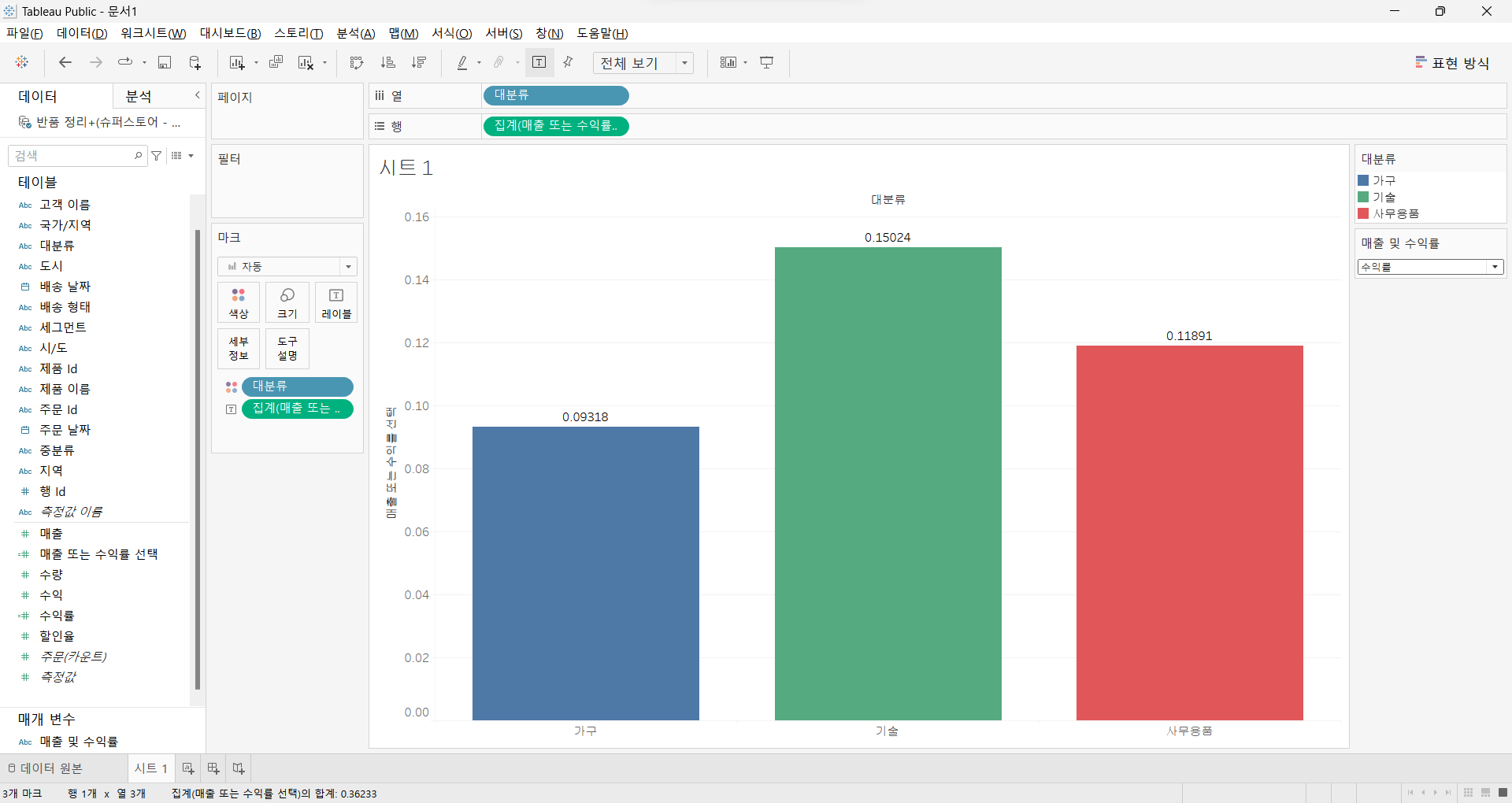 - 매출 또는 수익률 선택 필드를 행 선반으로 드래그