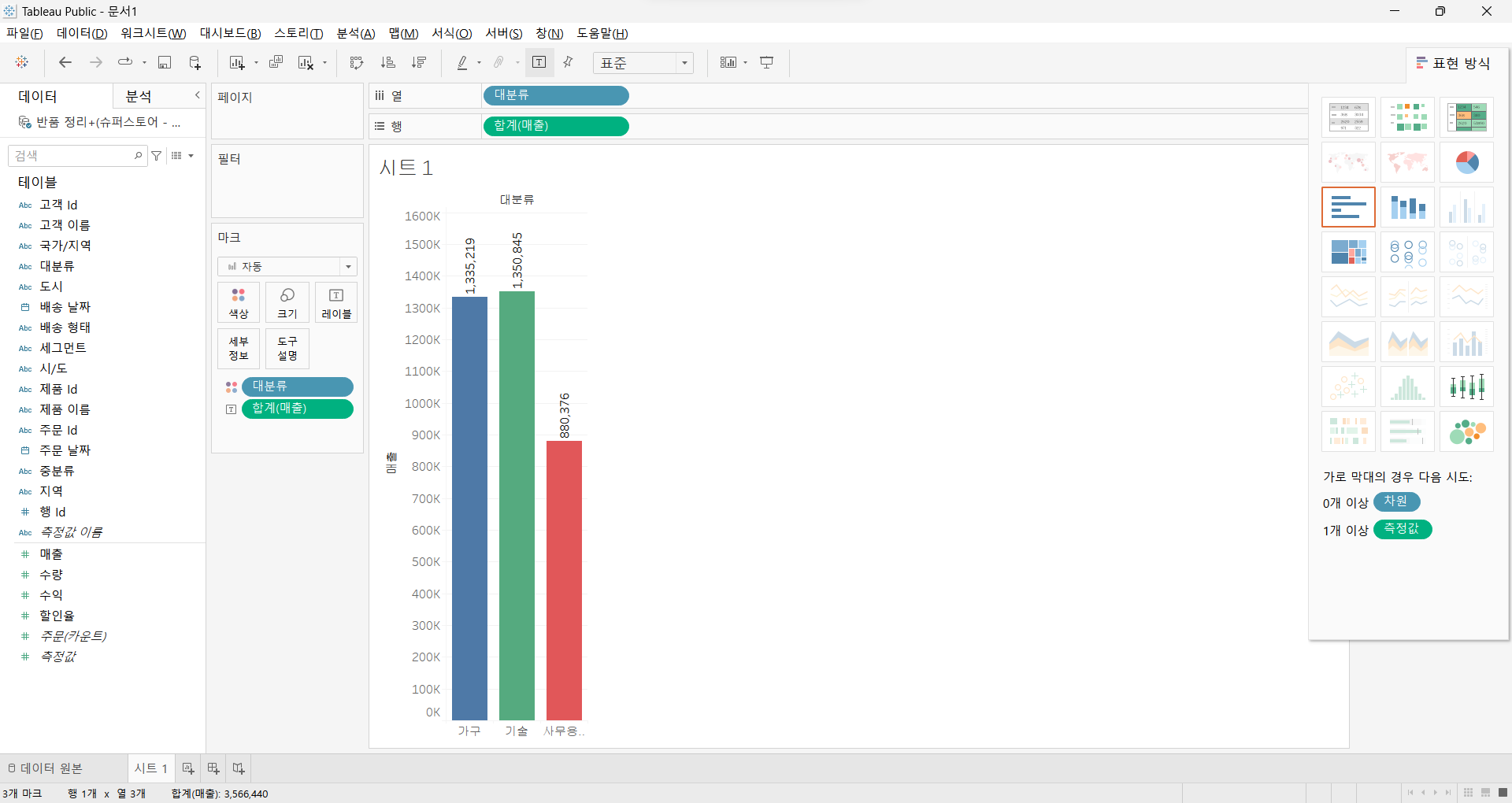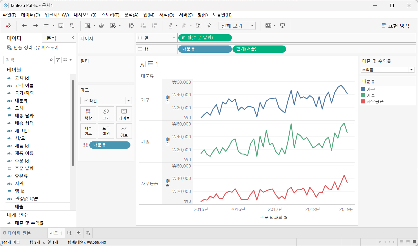 =>사이드바에서 필요한 필드를 전부 선택: 주문날짜, 대분류, 매출