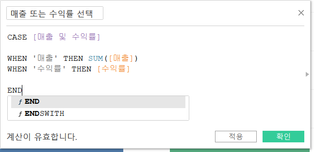 - 매개변수로 만든 [매출 또는 수익률] 을 선택하고 마우스 오른쪽을 눌러서 [매개 변수 표시]를 선택하면 오른쪽 창에 매출 이나 수익률을 선택할 수 있는 컨트롤러가 생겨, 선택을 하면 된다.