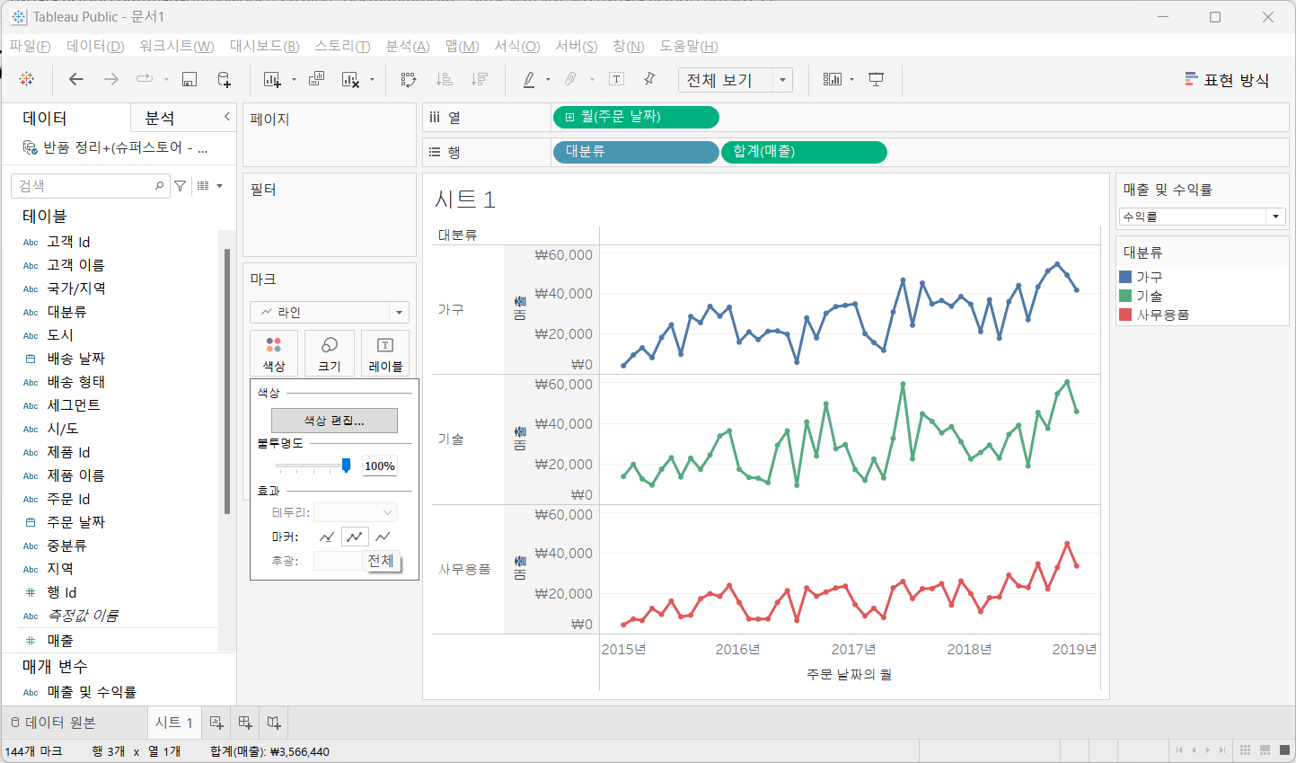 - 대분류 필드를 마크 카드의 색상으로 드래그