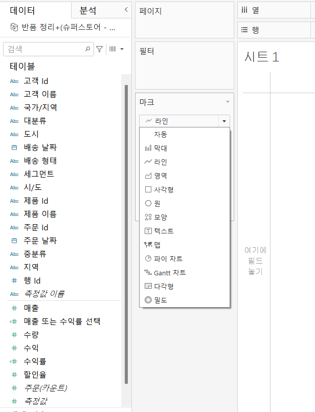 - 태블로에서 슈퍼 스토어 파일을 가져와서 주문 시트를 사용할 수 있도록 설정