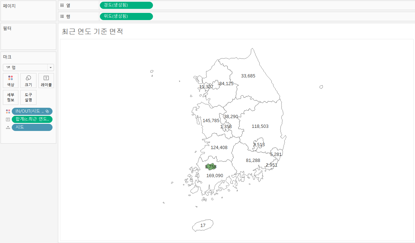 - 시도별 맵 분할 시트를 왼쪽 그리고 오른쪽에 최근 연도 기준 면적 시트를 배치