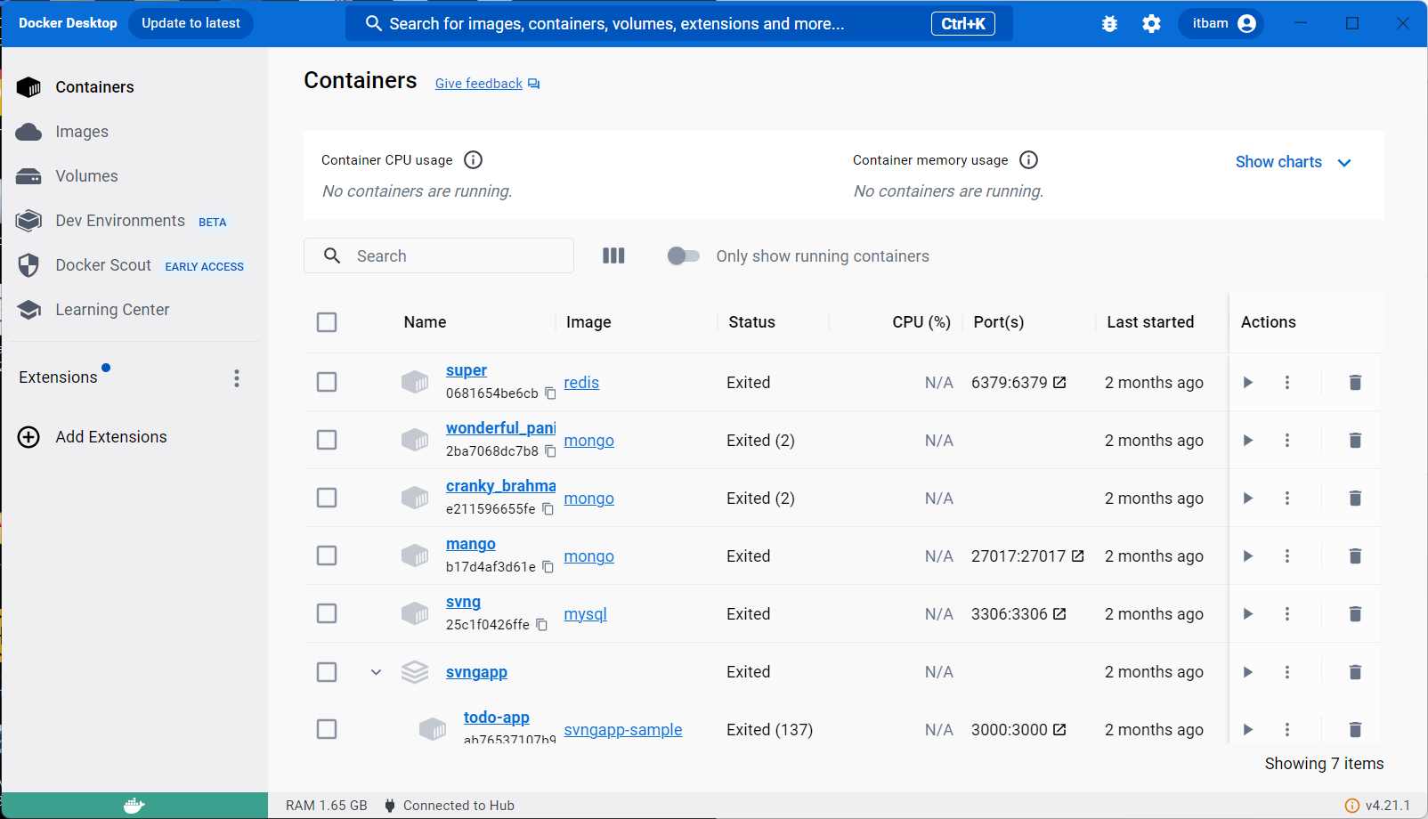 - -a 옵션을 사용하면 모든 컨테이너 목록을 출력하고 사용하지 않으면 실행 중인 컨테이너 목록을 출력
