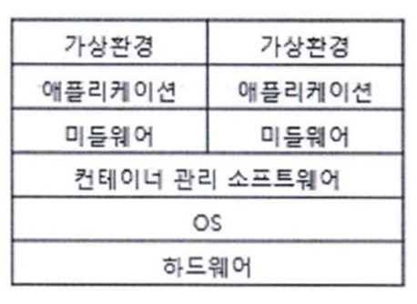 - 물리적인 컴퓨터(서버) > HOST OS > 컨테이너 관리 소프트웨어 > 미들웨어 > 애플리케이션